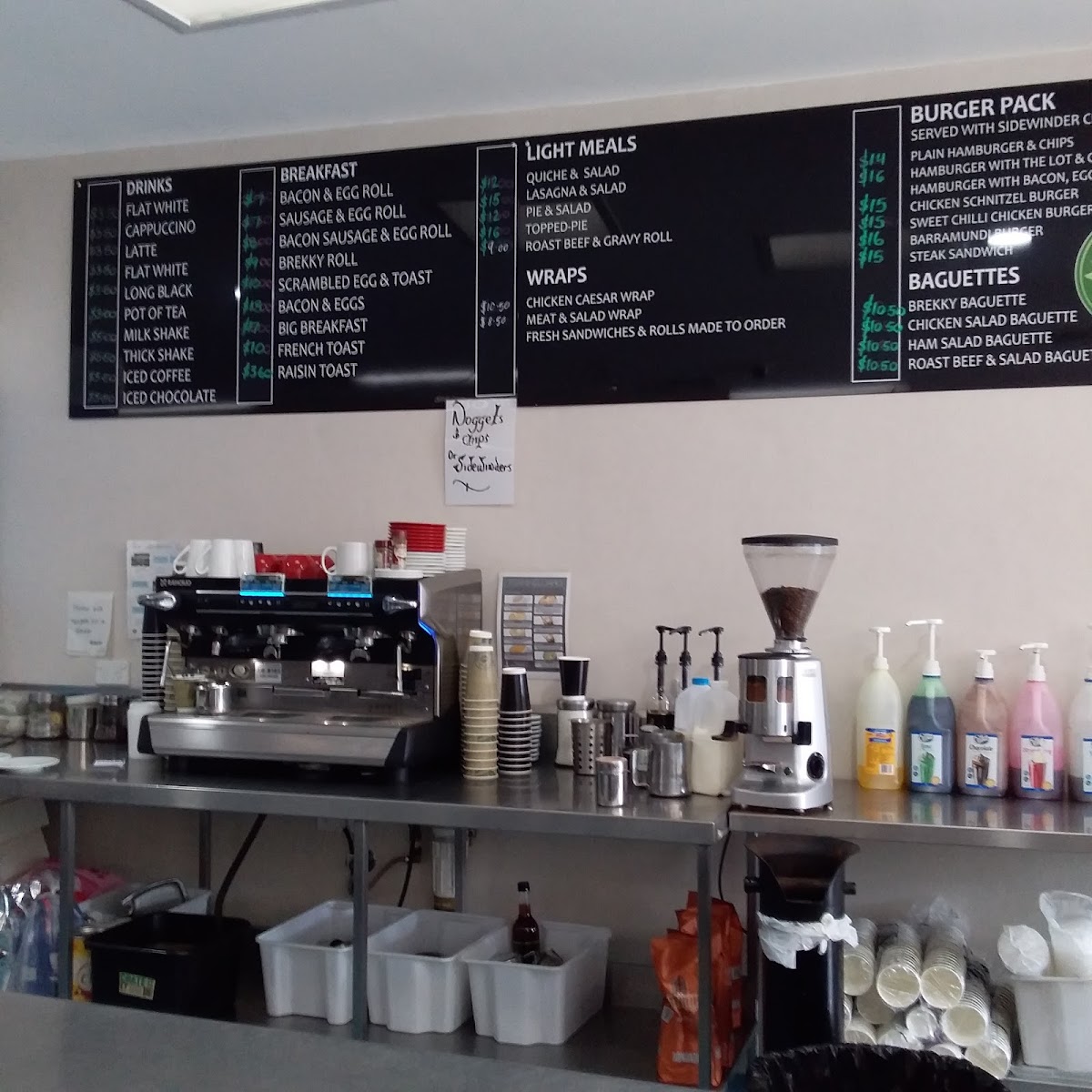The menu is structured to accommodate different meal times, with offerings that suit breakfast and lunch occasions. Coffee and beverages are available throughout the day, alongside baked goods and light food items. There is also a focus on accommodating families, with provisions like a dedicated kids' play area enhancing the casual dining setup.